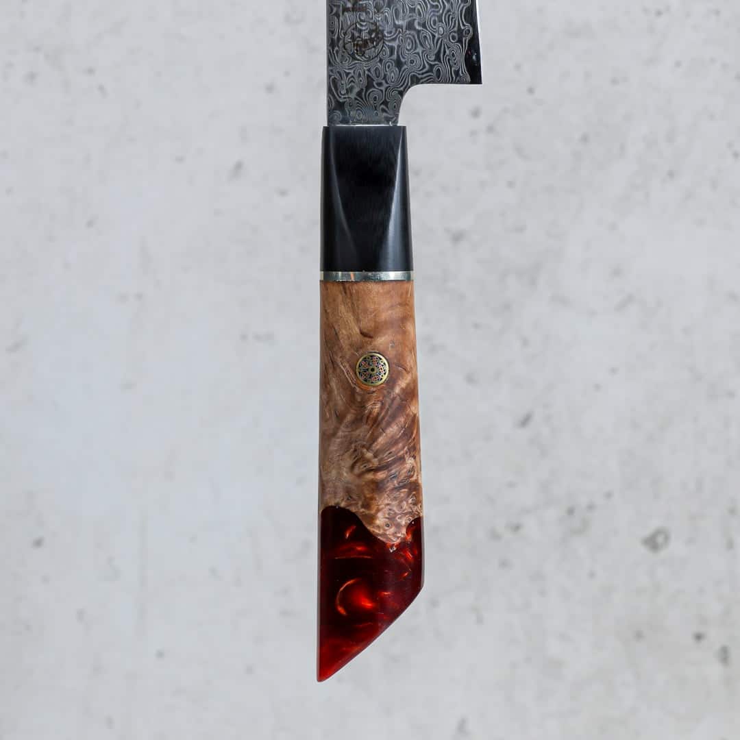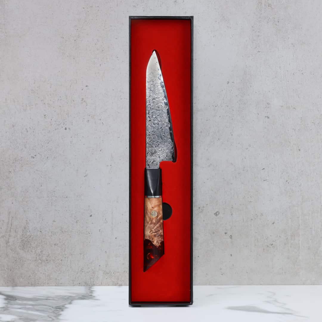 If a knife could be known as a masterpiece, the Petty Knife from Koi Knives would be it. You will be mesmerised by the ripples of Japanese steel fused with smooth resin and wood. Every handle of the Australian-made Koi Knives is completely one-of-a-kind. In terms of functionality, the Petty knife is the nimblest of the Koi Knives and is ideal for smaller cuts like paring fruits and vegetables. Koi’s Knives embrace nature’s beauty with master craftsmanship, making each knife as unique as the fingerprints of time. Each knife handle is crafted from organic Australian wood, reflecting nature’s individuality. Therefore, the images of handles will vary from knife to knife.