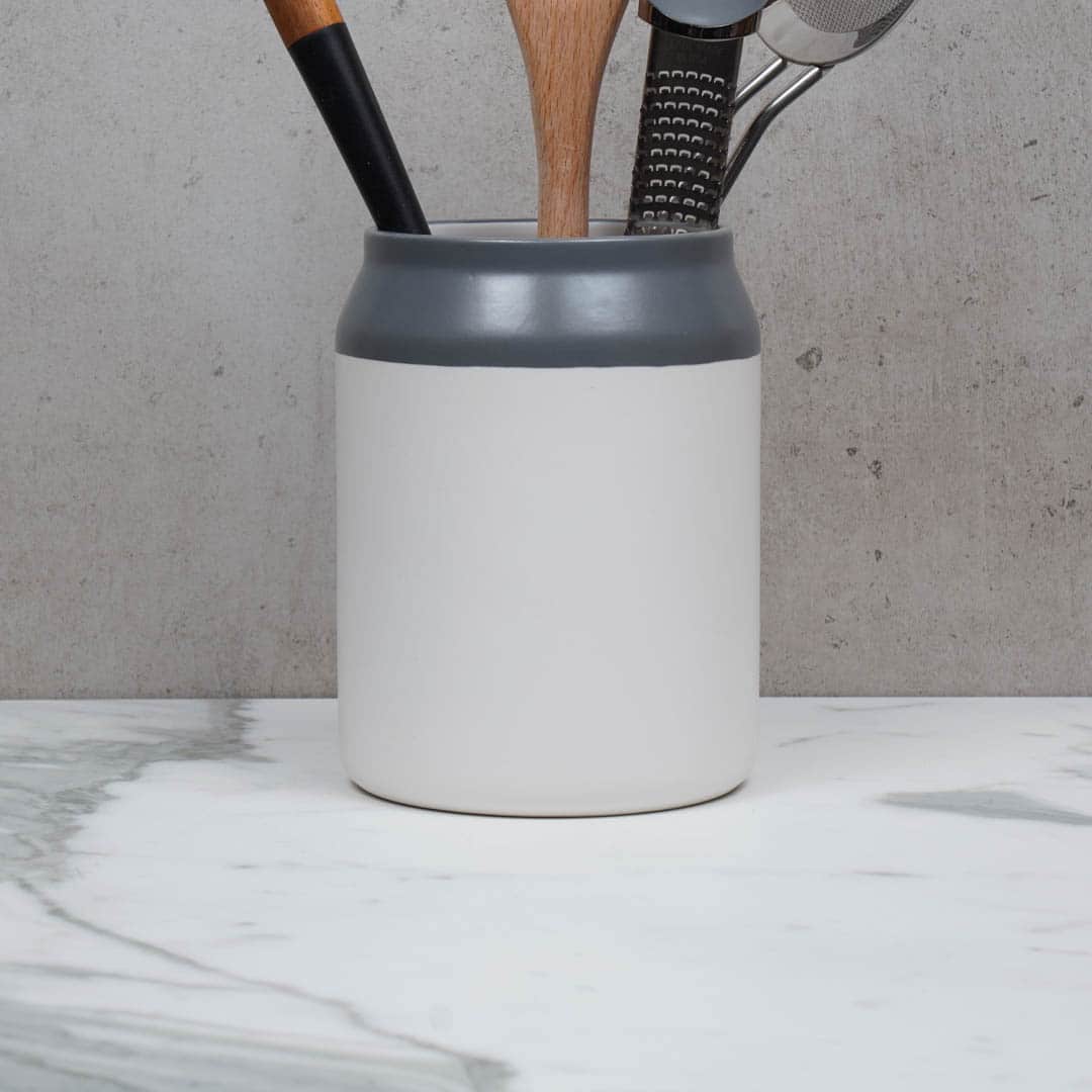 Kitchen countertops ought to feel welcoming and warm. After all, the space is often the hub of your home! This beautiful ceramic utensil holder from the Jamie Oliver kitchen collection is a lovely addition to your kitchen decor. The two-tone ceramic finish will give your countertop a natural and earthy look. But it’s also very functional. This holder can fit around 15 kitchen utensils—perfect for containing your go-to culinary tools within arm’s reach. In ours, we like to throw in a couple of wooden spoons, a whisk, a favourite spatula, a zester, a pair of tongs and a slotted spoon. How about you?